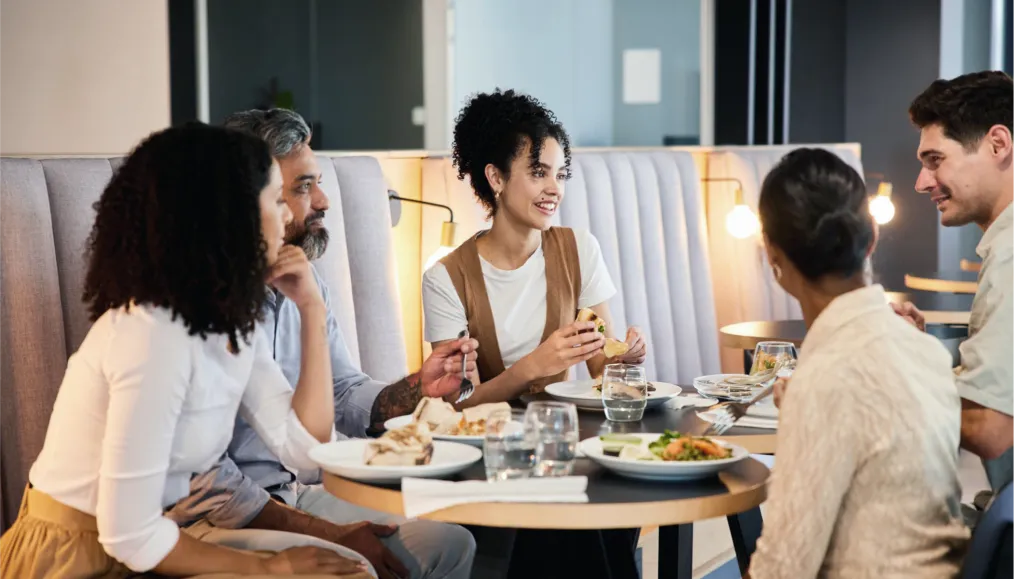 Les convives pourront choisir parmi une sélection d'entrées, desserts et fruits en libre-service, puis se rendre à l'un des 9 stands où un plat chaud leur sera servi. Simple, rapide et délicieux.